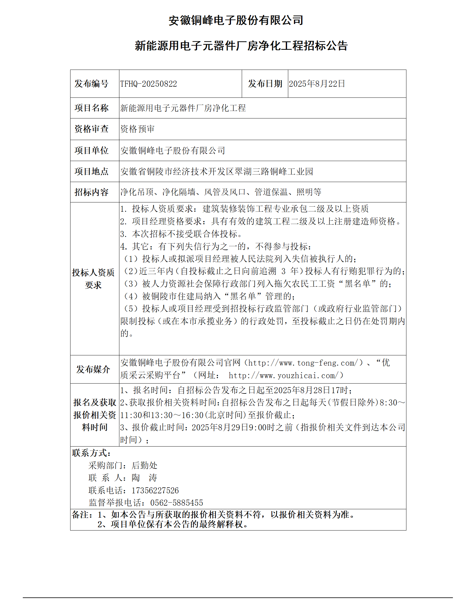 安徽銅峰電子股份有限公司 (新能源用電子元器件廠房凈化工程 招標(biāo)公告)_01